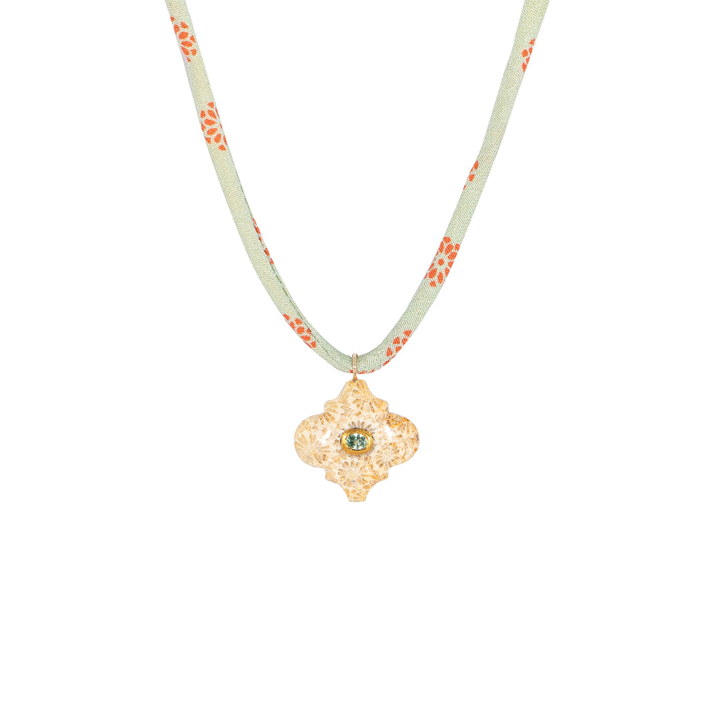 Coral fossil with a green sapphire inlaid gemstone in 18k yellow gold