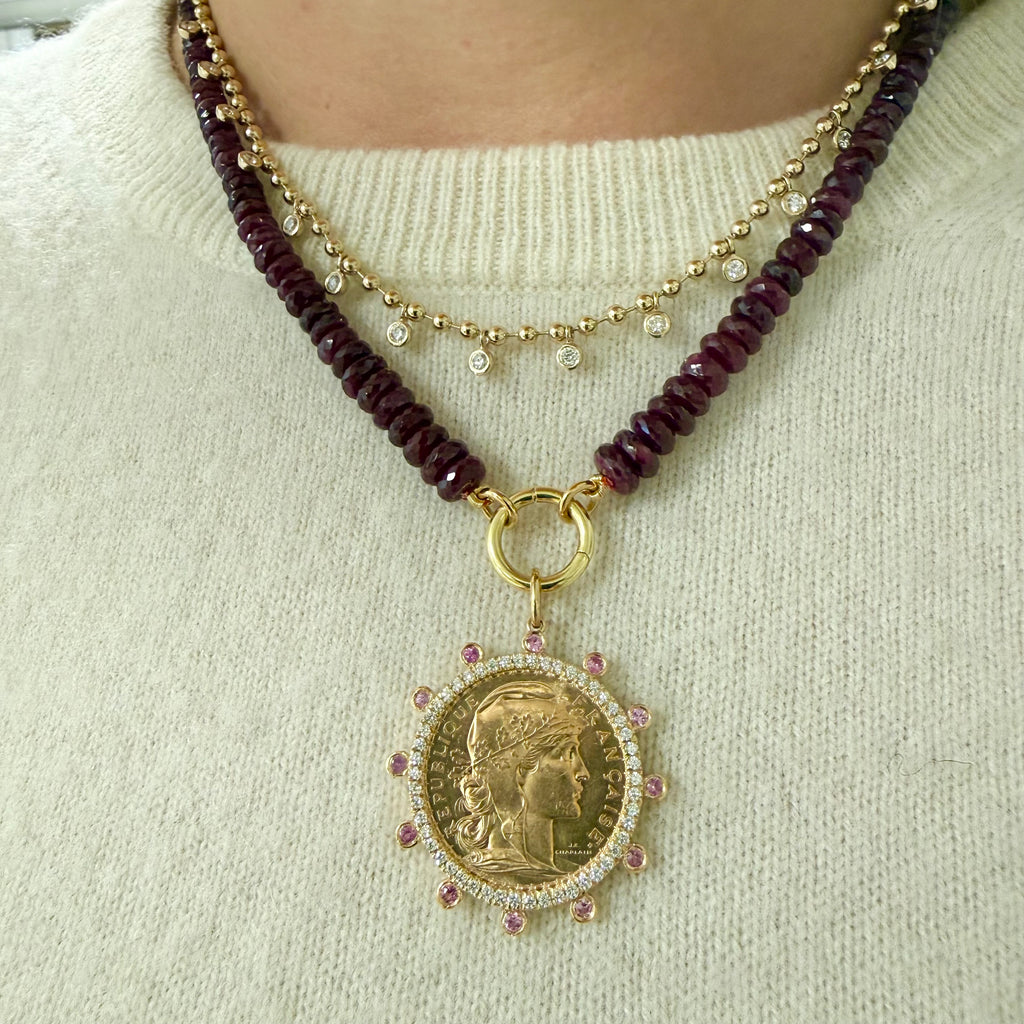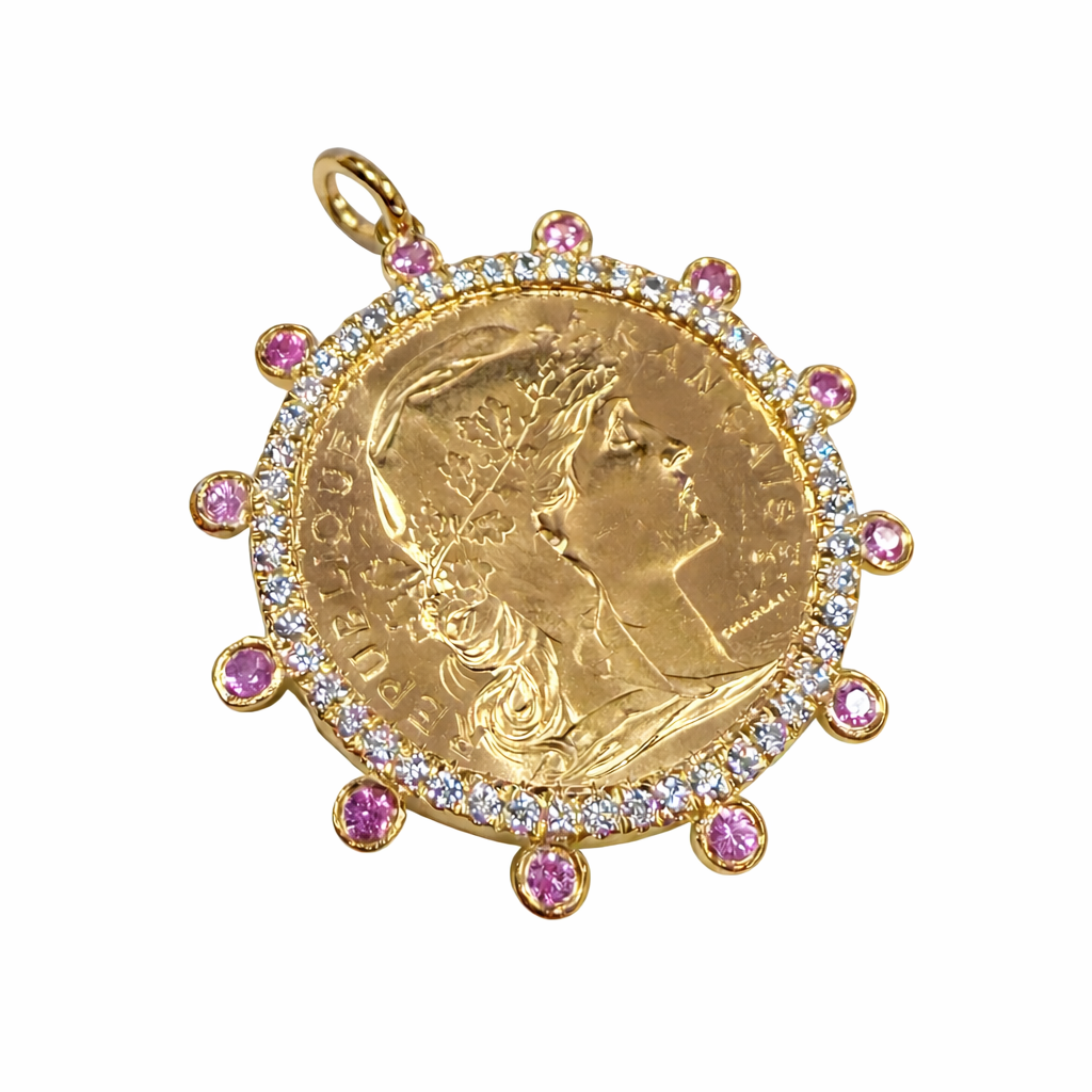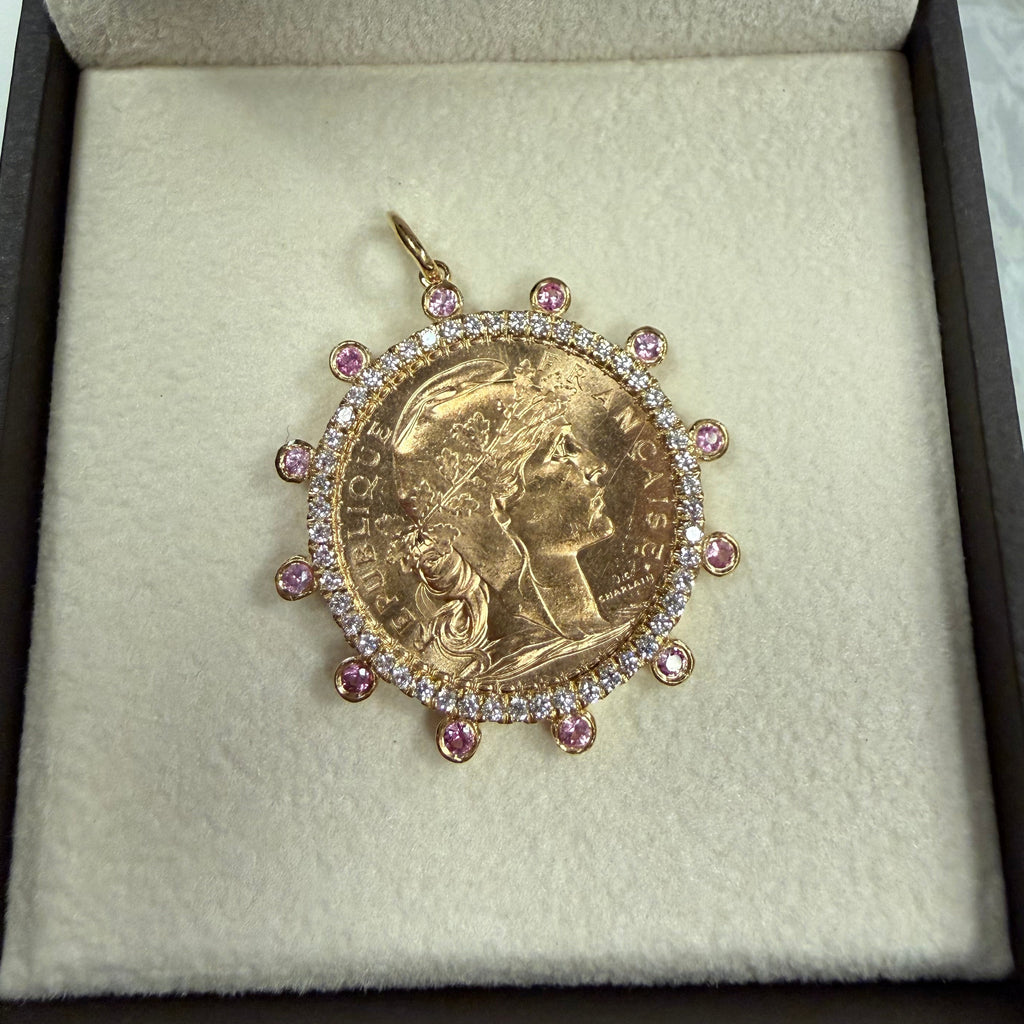 Set in 18k yellow gold with a diamond (VS clarity) and bezel set pink sapphire border