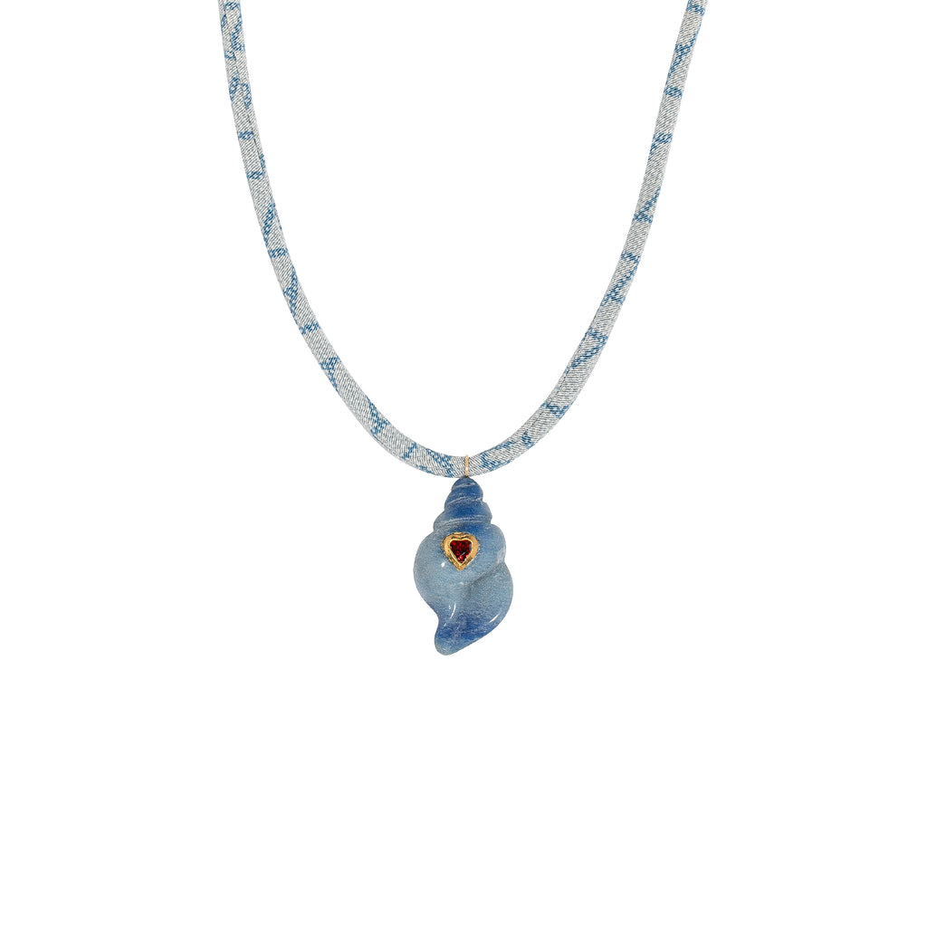 Blue quartz shell charm with a garnet inlaid gemstone in 18k yellow gold