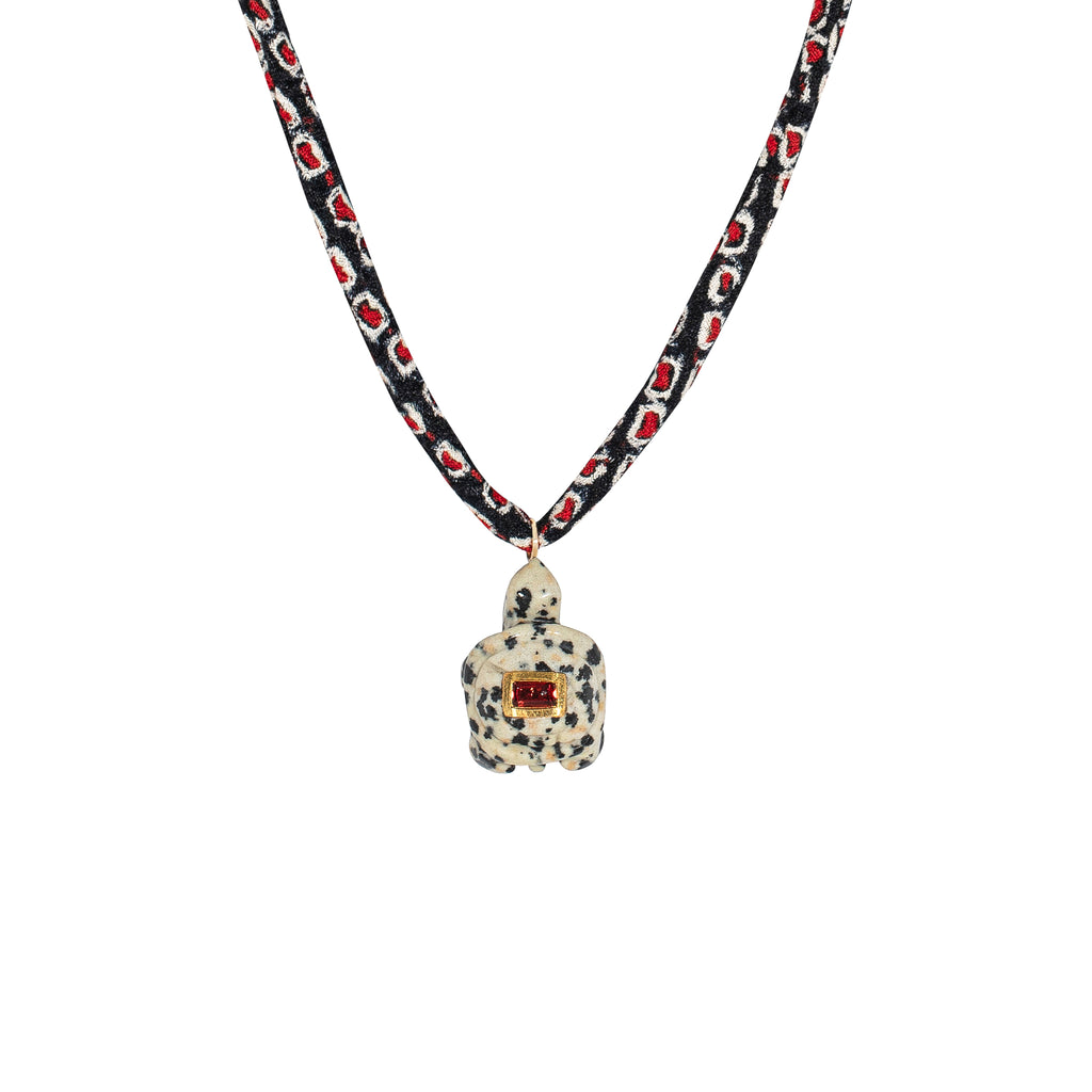 Dalmation jasper charm with a garnet inlaid gemstone in 18k yellow gold