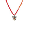 Hung from a silk cord with cream, orange and red tones, measuring 41 inches long