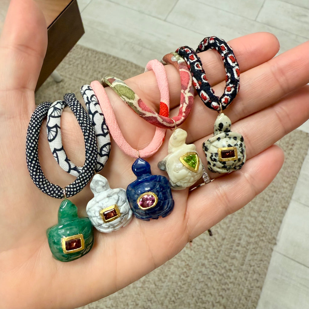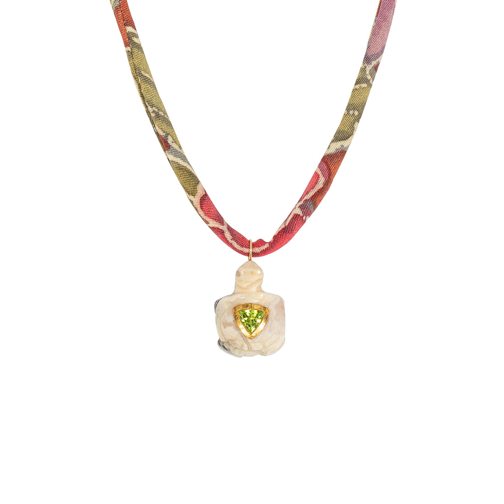 Lace agate tortoise charm with an inlaid peridot in 18k yellow gold