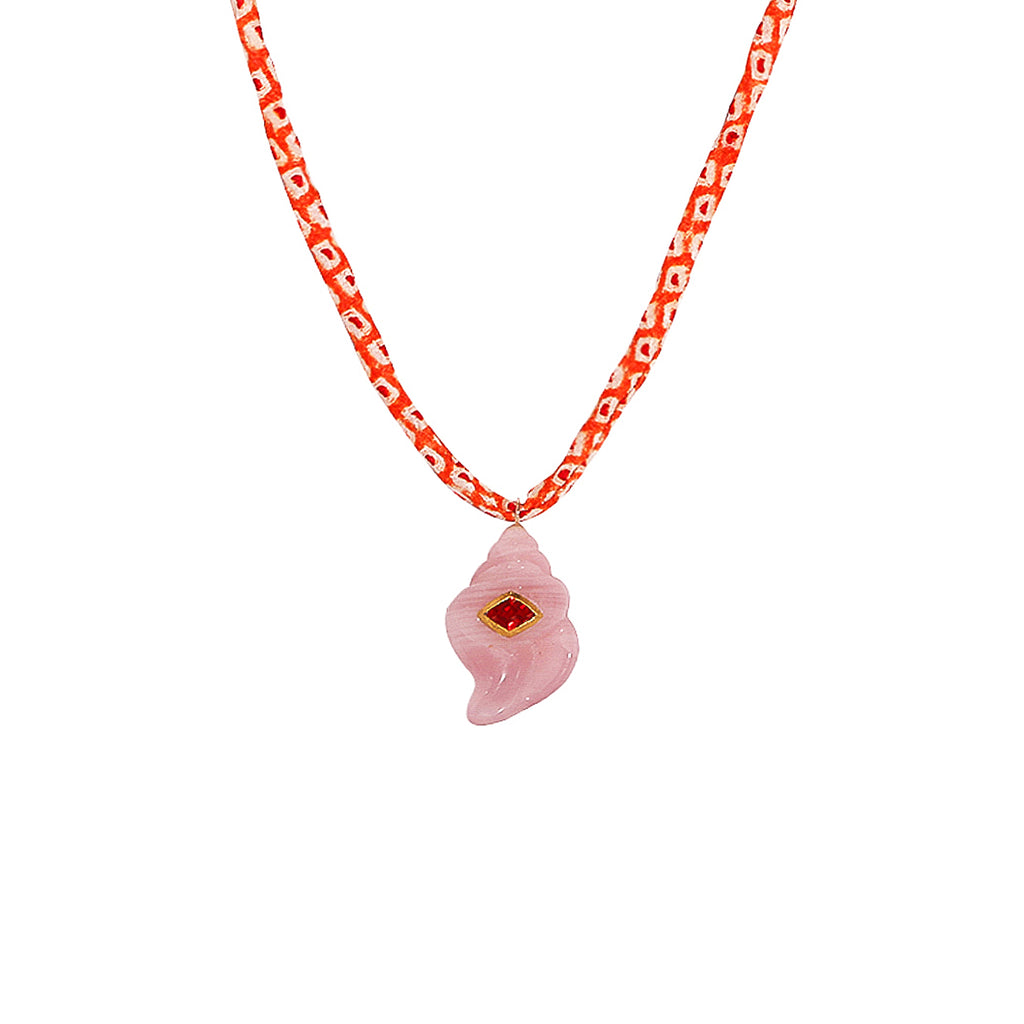 Rose quartz shell charm with a garnet inlaid gemstone in 18k yellow gold