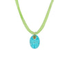 Hung from a chartreuse green silk cord, measuring 41 inches long